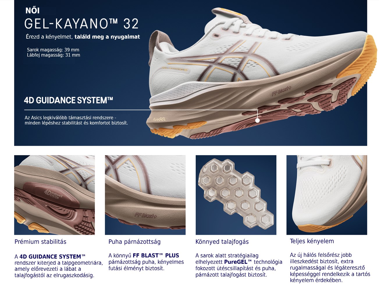 A Kayano család legújabb tagja, az Asics Gel-Kayano 32 futócipő a támogatás és a kényelem csúcsát biztosítja futásaid során. Az FF BLAST PLUS középtalpat magasabb párnázással kombinálták, miközben csökkentették a súlyt, hogy a cipő kiegyensúlyozottabb élményt nyújtson, így simább és kényelmesebb futást biztosít. A megerősített nyelv további kényelmet és támogatást nyújt, a 4D GUIDANCE SYSTEM pedig adaptív stabilitást biztosít, így sokkal támogatóbb és kiegyensúlyozottabb lépést tapasztalhatsz meg.