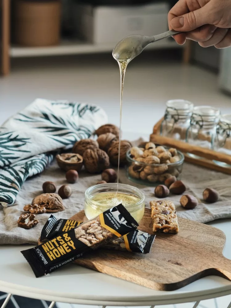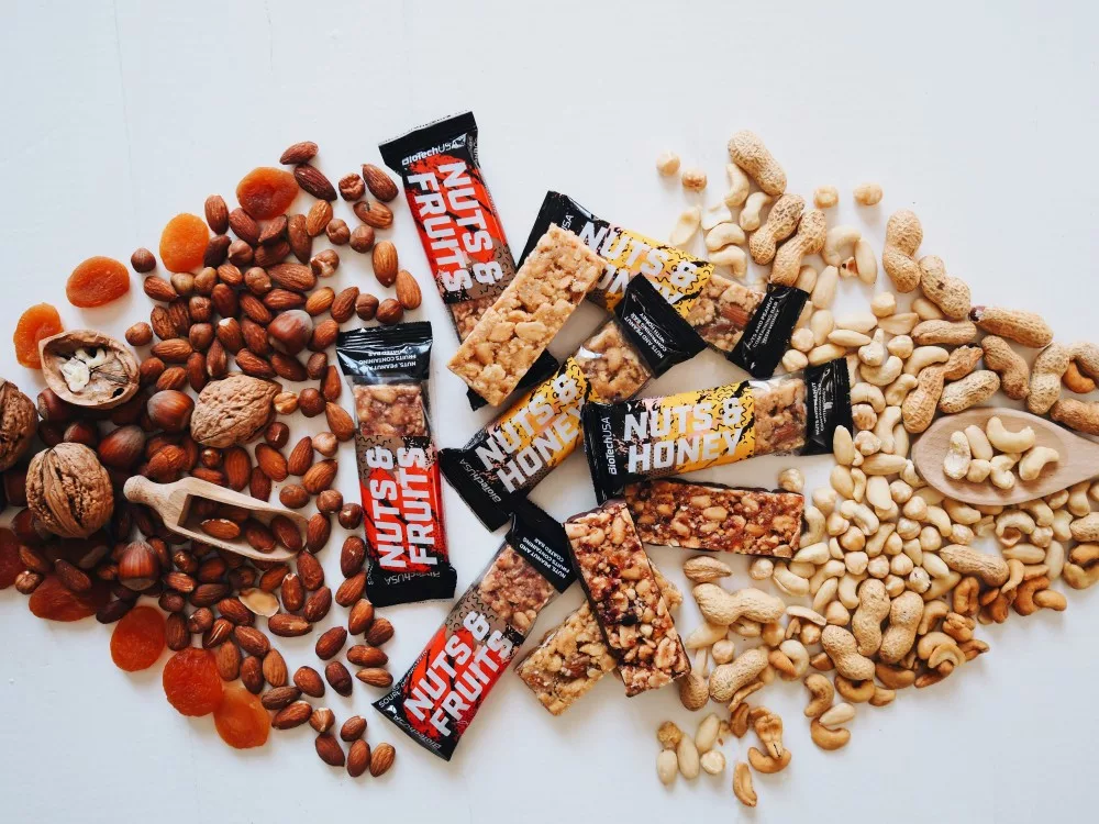Összetevők: Földimogyoró darabok 55%, mandula darabok 10%, fruktóz szirup, glükóz szirup, extrudált gabonák (teljes kiőrlésű liszt, búzadara, rizs, cukor, étkezési só), méz 5%, mogyoró darabok 2%, brazil dió darabok 2%, dextróz, emulgeálószer: lecitinek (szója). Nyomokban egyéb dióféléket, tejet, szezámmagot, tojást és kén-dioxidot tartalmazhat.