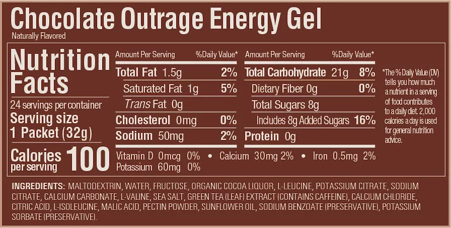 Összetevők: Maltodextrin, víz, fruktóz, természetes kakaó likőr, L-leucin, nátrium-citrát, kálium-citrát, kalcium-karbonát, L-valin, tengeri só, zöld tea (levél) kivonat (koffeint tartalmaz), kalcium-klorid, citromsav, L-izoleucin, almasav, pektinpor napraforgóolaj, tartósítószerek (nátrium-benzoát, kálium-szorbát).