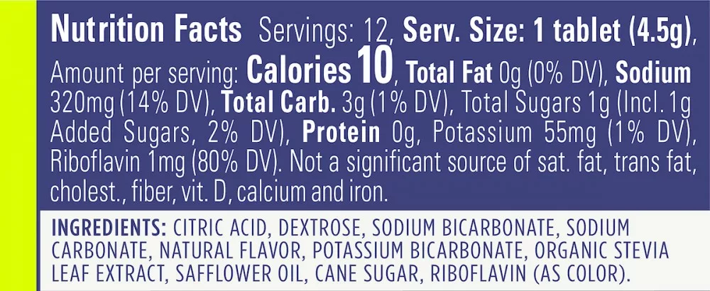 Összetevők: Citromsav, dextróz, nátrium-hidrogénkarbonát, nátrium-karbonát, természetes aroma, kálium-hidrogénkarbonát, bio sztevia levélkivonat, sáfránymagolaj, nádcukor, riboflavin (színezékként).