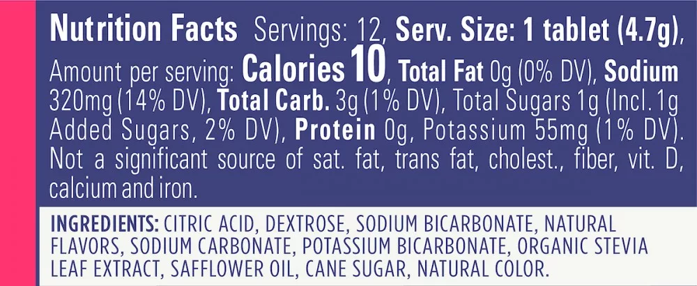Összetevők: Citromsav, dextróz, nátrium-hidrogénkarbonát, természetes aromák, nátrium-karbonát, kálium-hidrogénkarbonát, bio sztevia levélkivonat, sáfránymagolaj, nádcukor, természetes színezék.
