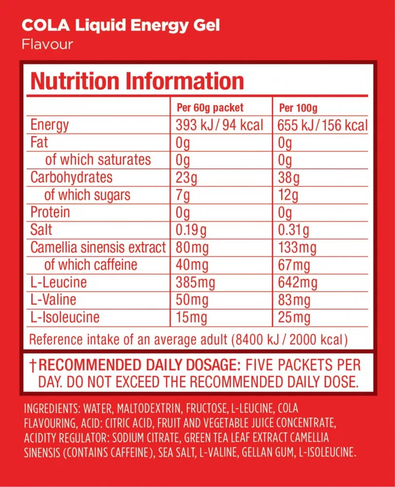 Összetevők: Víz, maltodextrin, fruktóz, kólaaroma, L-leucin, citromsav, zöldség- és gyümölcslé koncentrátum, savanyúságot szabályozó anyag: nátrium-citrát, zöld tea levélkivonat (koffeint tartalmaz), tengeri só, L-valin, gellán gumi, L-izoleucin.