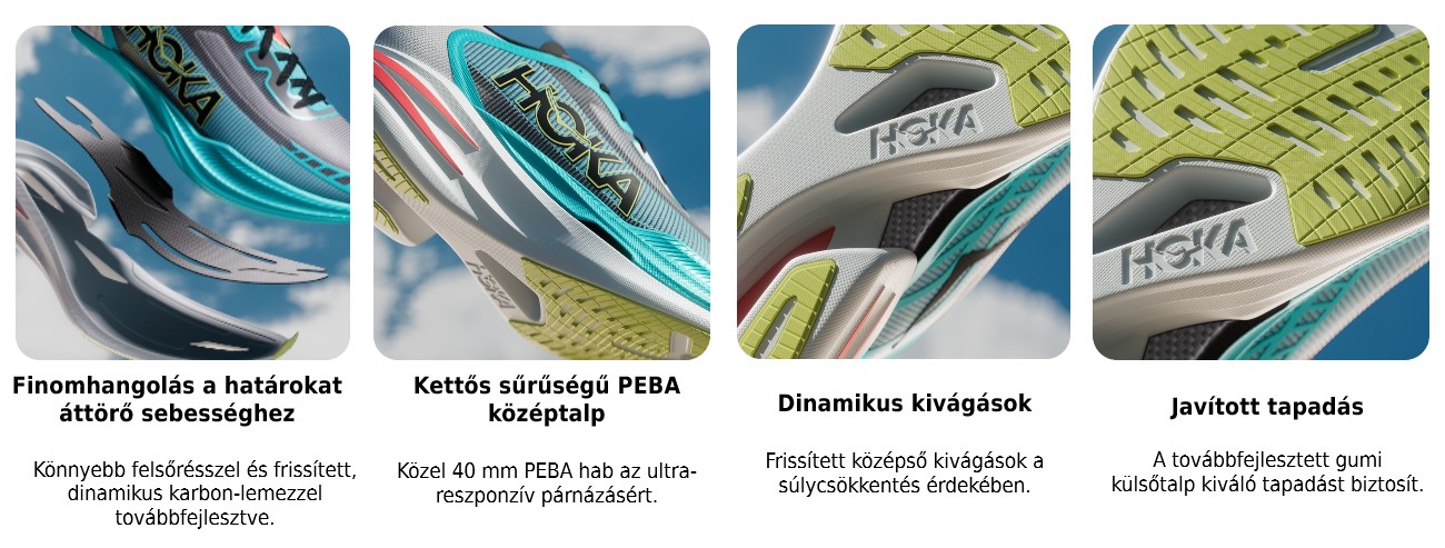 A Hoka Cielo X1 2.0 egy versenyre tervezett, nagy teljesítményű futócipő, amely a sebességet kereső futók számára kötelező darab. A cipő agresszív orr-rész kialakítással és ultra-reszponzív, kettős sűrűségű PEBA középtalppal rendelkezik, amelyet egy dinamikus karbon-lemez egészít ki a gyorsabb reakció érdekében. A könnyű, légáteresztő felsőrész biztosítja a kényelmet és a szellőzést, míg a külső gumitalp javítja a tapadást a versenyek során. A cipő a súlycsökkentés érdekében dinamikus kivágásokkal, a kényelem érdekében pedig párnázott kéreggel lett ellátva. A Cielo X1 2.0 ideális választás a sebességre összpontosító futók számára, akik a legjobb teljesítményt kívánják elérni.
