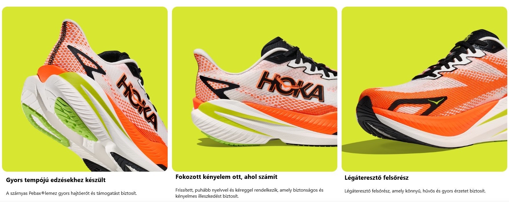 A Hoka Mach X 3 tempós edzésekre, versenyekre tervezett futócipő, amely felpörgeti a sebességed. Az extra rugalmas PEBA középtalppal és a rugalmas Pebax® lemezzel készült cipő a gyorsaságra lett kifejlesztve. A finomított kéregnek és a légáteresztő felsőrésznek köszönhetően a cipő könnyű, hűvös és gyors marad a magasabb szintű teljesítményekhez.