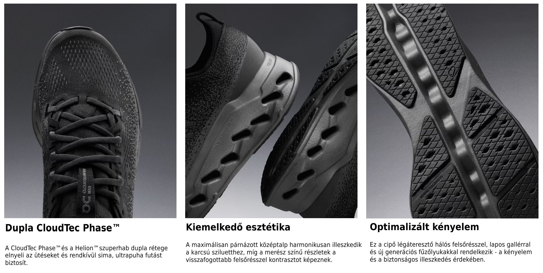 Az On Cloudsurfer Max egy maximális párnázottságú cipő hosszú, könnyed futásokhoz. A Double CloudTec Phase™ kényelmes, sima érzést biztosít.