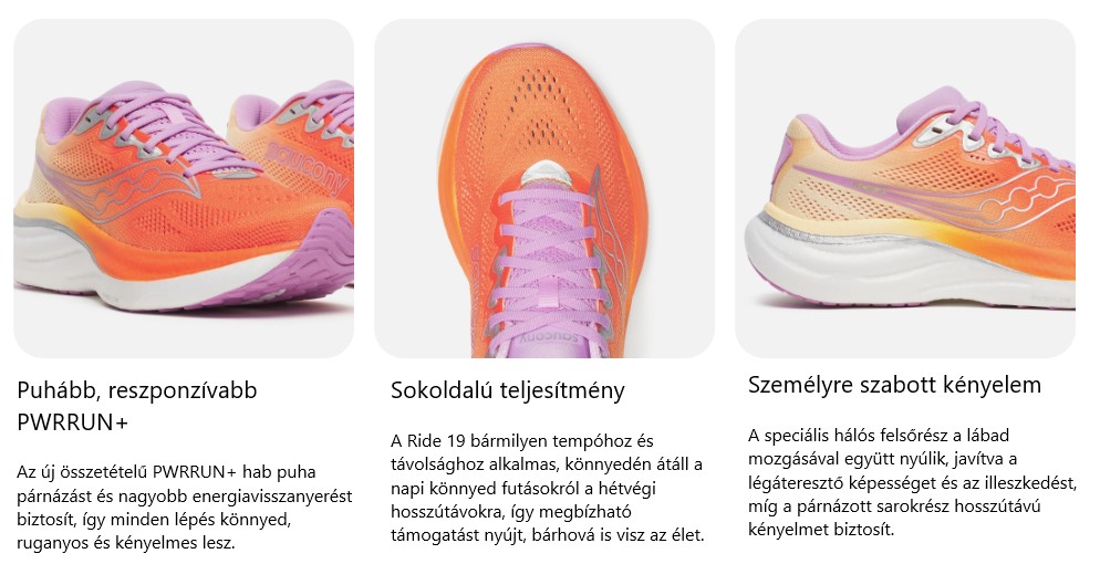 A Saucony Ride 19 puhább, könnyebb és még reszponzívabb, mint korábbi generációi, így kényelmes, energikus futóélményt nyújt hosszabb és rövidebb távokon egyaránt. Az új PWRRUN+ hab középtalp kényelmes párnázást és jó energia-visszanyerést biztosít, miközben simább talajfogást és gördülékeny átmeneteket tesz lehetővé. A felsőrész légáteresztő, rugalmas hálóból készült, ami igazodik a láb formájához és kényelmes illeszkedést biztosít.